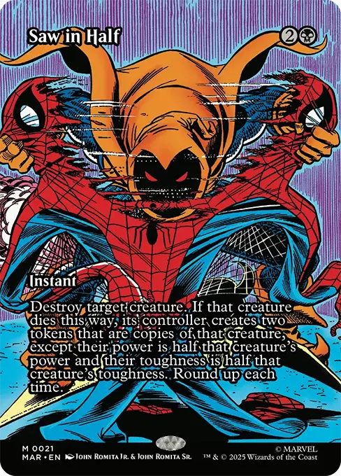 消滅目標生物。如果該生物以此法死去,則其操控者派出兩個為該生物之複製品的衍生物,但它們的力量均為該生物力量的一半,且它們的防禦力也均為該生物防禦力的一半。各數量小數點後均進位。