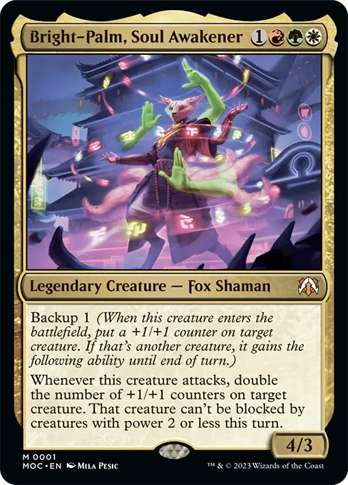 後援1(當此生物進場時,在目標生物上放置一個+1/+1指示物。若後者是另一個生物,則它獲得下文之異能直到回合結束。)