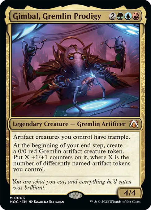 傳奇生物 – 怪靈/神器師由你操控的神器生物具有踐踏異能。在你的結束步驟開始時,派出一個0/0紅色怪靈衍生神器生物。在其上放置X個+1/+1指示物,X為由你操控之不同名稱的衍生神器種數。