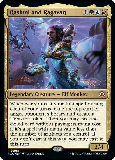 每當你施放自己每個回合中你的第一個咒語時,放逐目標對手的牌庫頂牌並派出一個珍寶衍生物。然後如果它是魔法力值小於由你操控之神器數量的咒語,則你可以施放所放逐的牌,且不需支付其魔法力費用。若你未以此法施放之,則你本回合中可以施放該牌。
