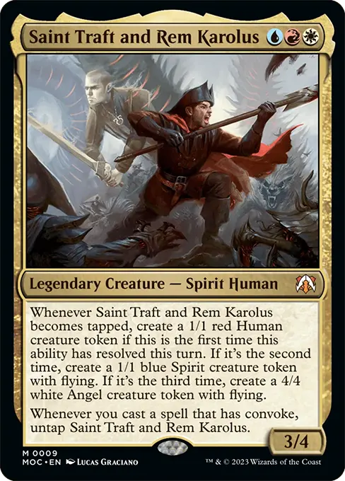 每當聖沙弗與連卡洛成為橫置時,如果這是此異能在本回合第一次的結算,則派出一個1/1紅色人類衍生生物。如果是第二次的結算,則派出一個1/1藍色,具飛行異能的精靈衍生生物。如果是第三次的結算,則派出一個4/4白色,具飛行異能的天使衍生生物。