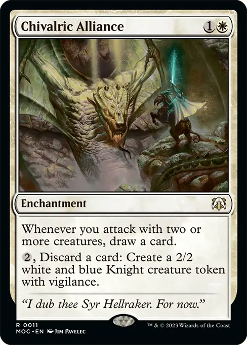 每當你以兩個或更多生物攻擊時,抽一張牌。