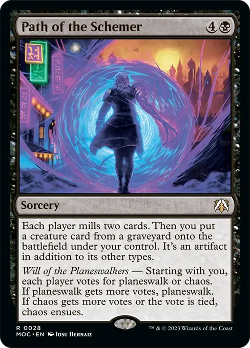 每位玩家各磨兩張牌。然後你將一張生物牌在你的操控下從墳墓場放進戰場。它額外具有神器此類別。
