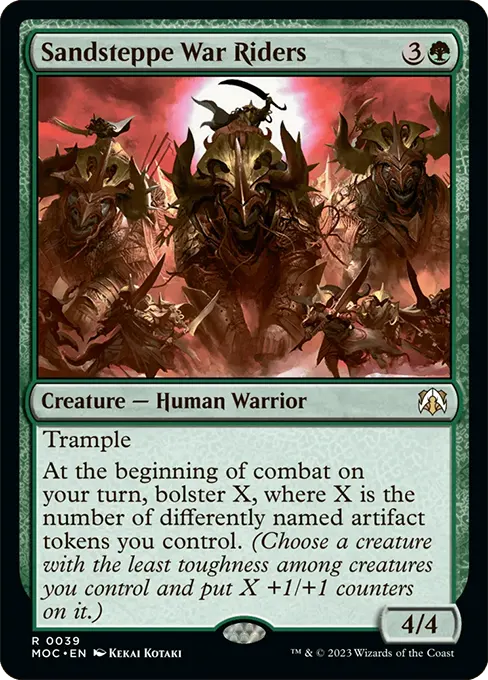 在你回合的戰鬥開始時,振勵X,X為由你操控之衍生神器中名稱不同者的種數。(於由你操控的生物中選擇一個防禦力最小的生物,在其上放置X個+1/+1指示物。)
