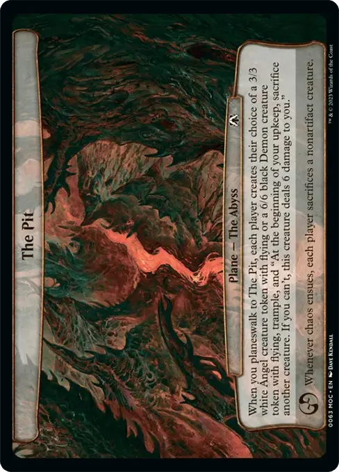 當你時空換入暗淵時,每位玩家各依其選擇派出一個3/3白色,具飛行異能的天使衍生生物;或6/6黑色惡魔衍生生物,且具有飛行、踐踏與「在你的維持開始時,犧牲另一個生物。若你無法如此作,則此衍生物對你造成6點傷害」的惡魔衍生生物。
