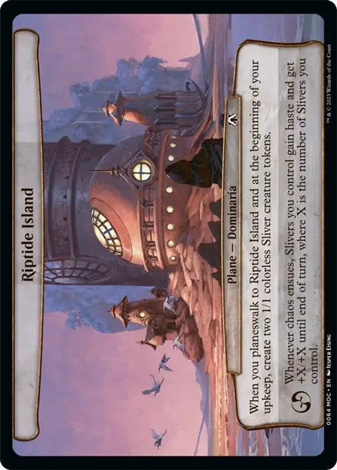 時空 – 多明納裏亞當你時空換入激流島和在你的維持開始時,派出兩個1/1無色裂片妖衍生生物。每當引發混沌時,直到回合結束,由你操控的裂片妖獲得敏捷異能且得+X/+X,X為由你操控的裂片妖數量。