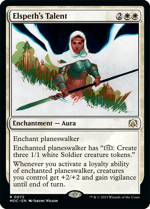 所結附的鵬洛客具有「+1:派出三個1/1白色士兵衍生生物。」