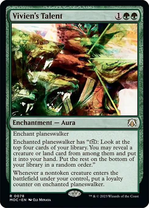 所結附的鵬洛客具有「+1:檢視你牌庫頂的四張牌。你可以展示其中一張生物或地牌並置於你手上。將其餘的牌以隨機順序置於你牌庫底。」