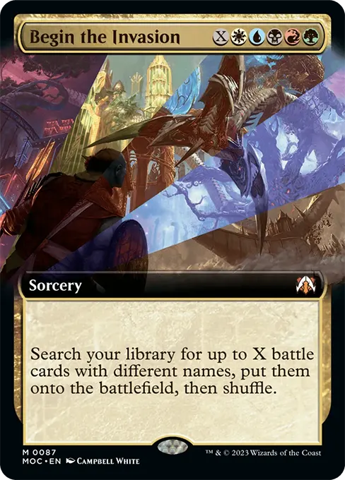 從你的牌庫中搜尋至多X張名稱各不相同的戰役牌,將它們放進戰場,然後洗牌。