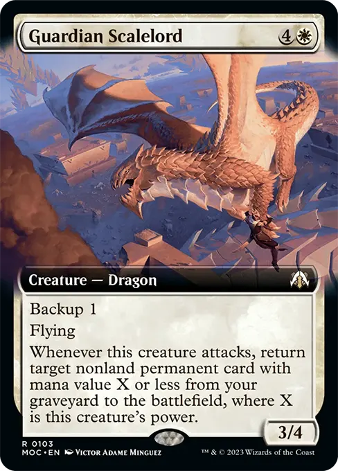 後援1(當此生物進場時,在目標生物上放置一個+1/+1指示物。若後者是另一個生物,則它獲得下文之異能直到回合結束。)
