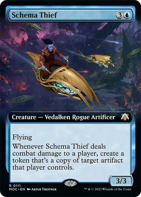 每當此生物對任一玩家造成戰鬥傷害時,派出一個衍生物,此衍生物為目標由該玩家操控之神器的複製品。