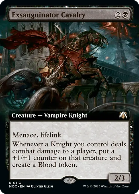 每當一個由你操控的騎士對任一玩家造成戰鬥傷害時,在該生物上放置一個+1/+1指示物並派出一個血滴衍生物。(它是具有「{1},{T},棄一張牌,犧牲此衍生物:抽一張牌」的神器。)