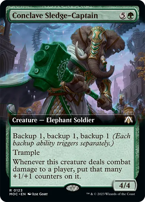 後援1,後援1,後援1(當此生物進場時,在目標生物上放置一個+1/+1指示物。若後者是另一個生物,則它獲得下文之異能直到回合結束。每個後援異能都會分別觸發。)