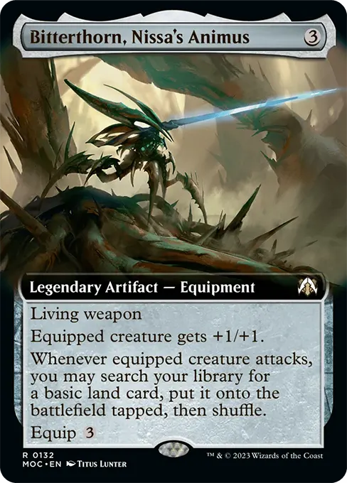 每當佩帶此武具的生物攻擊時,你可以從你牌庫中搜尋一張基本地牌,將之橫置放進戰場,然後洗牌。