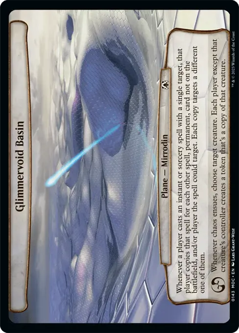 每當引發混沌時,選擇目標生物。該生物操控者以外的每位玩家各派出一個為該生物複製品之衍生物。