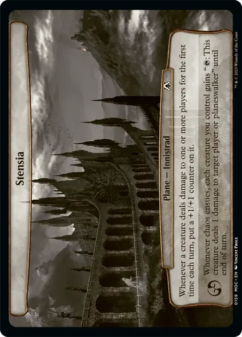 時空 – 依尼翠每當一個生物每回合首度對一位或多位玩家造成傷害時,在其上放置一個+1/+1指示物。每當引發混沌時,每個由你操控的生物均獲得「{T}:此生物對目標玩家或鵬洛客造成1點傷害」直到回合結束。