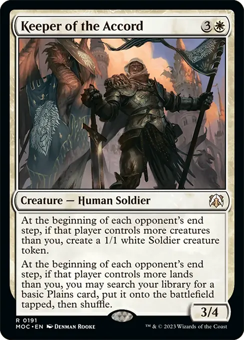 在每位對手的結束步驟開始時,若該玩家操控的生物比你多,則你派出一個1/1白色士兵衍生生物。
