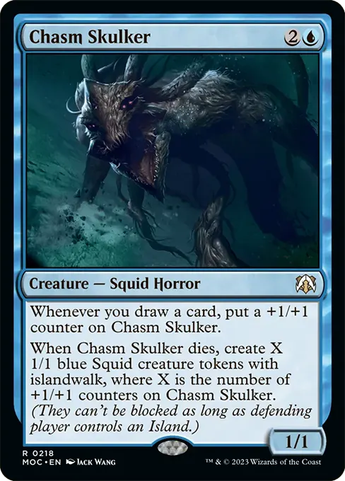 當此生物死去時,派出X個1/1藍色,具海島行者異能的烏賊衍生生物,X為此生物上的+1/+1指示物數量。(只要防禦玩家操控海島,它們便不能被阻擋。)