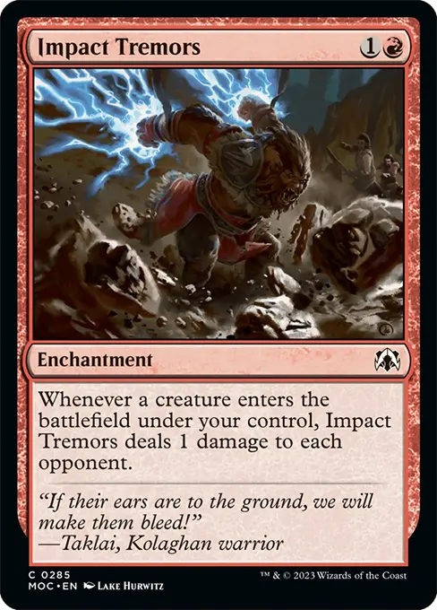 每當一個由你操控的生物進場時,此結界向每位對手各造成1點傷害。