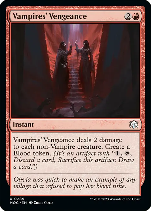 吸血鬼復仇對每個非吸血鬼生物各造成2點傷害。派出一個血滴衍生物。(它是具有「{1},{T},棄一張牌,犧牲此衍生物:抽一張牌」的神器。)