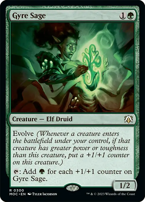 生物 – 妖精/德魯伊進化(每當一個由你操控的生物進場時,若該生物的力量或防禦力大於此生物,則在後者上放置一個+1/+1指示物。){T}:此生物上每有一個+1/+1指示物,便加{G}。