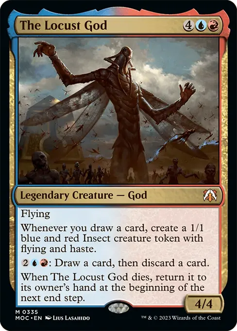 傳奇生物 – 神飛行每當你抽一張牌時,派出一個1/1藍紅雙色,具飛行與敏捷異能的昆蟲衍生生物。{2}{U}{R}:抽一張牌,然後棄一張牌。當蝗蟲神死去,在下一個結束步驟開始時,將它移回其擁有者手上。
