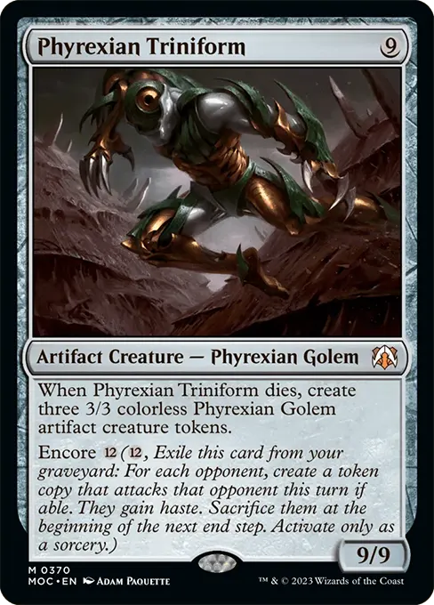 當此生物死去時,派出三個3/3無色非瑞人/魔像衍生神器生物。