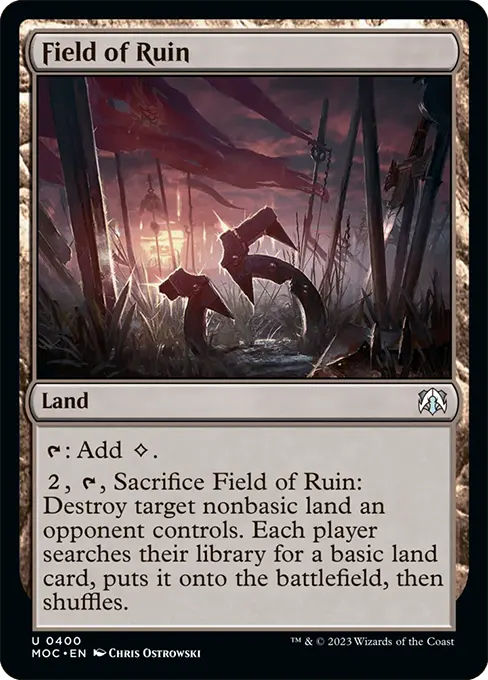 {2},{T},犧牲此地:消滅目標由對手操控的非基本地。每位玩家各從其牌庫中搜尋一張基本地牌,將之放進戰場,然後洗牌。