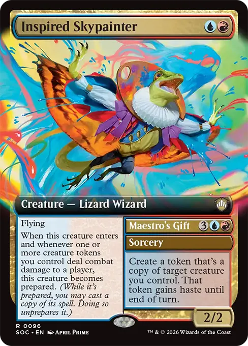 當此生物進場及每當一個或數個由你操控的衍生生物對任一玩家造成戰鬥傷害時,此生物成為已備法。(於其已備法期間,你可以施放其上咒語的複製品。施放之後其便撤法。)