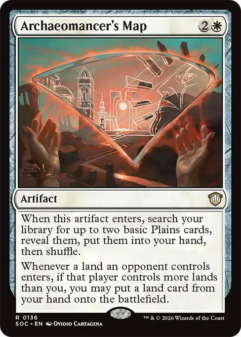 神器當此神器進場時,從你牌庫中搜尋至多兩張基本的平原牌,展示這些牌,將它們置於你手上,然後洗牌。每當一個由對手操控的地進場時,若該玩家操控的地比你多,則你可以將一張地牌從你手上放進戰場。
