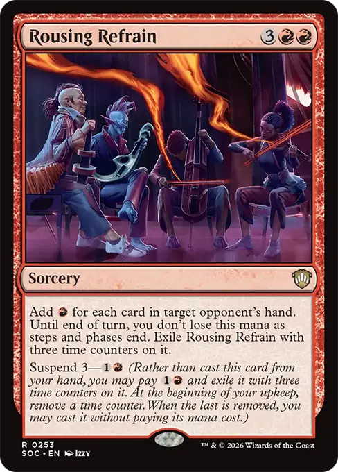 目標對手每有一張手牌,便加{R}。直到回合結束,你不會因步驟與階段結束失去這份魔法力。放逐醒神旋律,且上面有三個計時指示物。