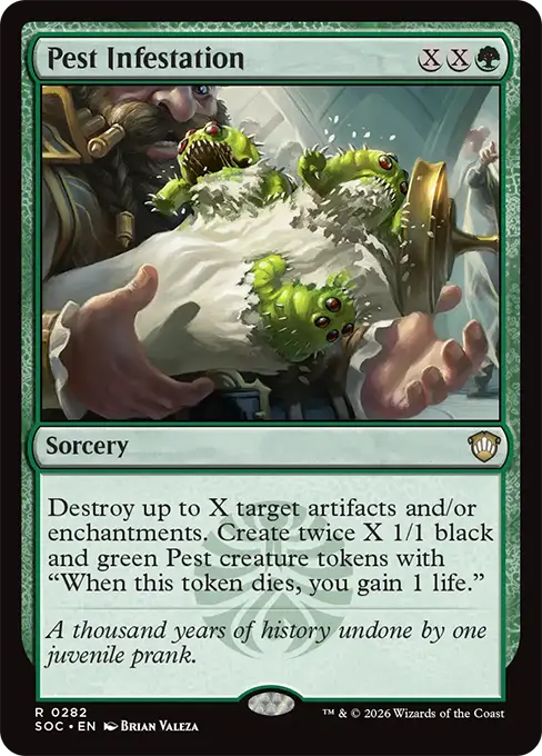 消滅至多X個目標神器和/或結界。派出兩倍於X數量的1/1,黑綠雙色的害蟲衍生生物,且具有「當此衍生物死去時,你獲得1點生命。」