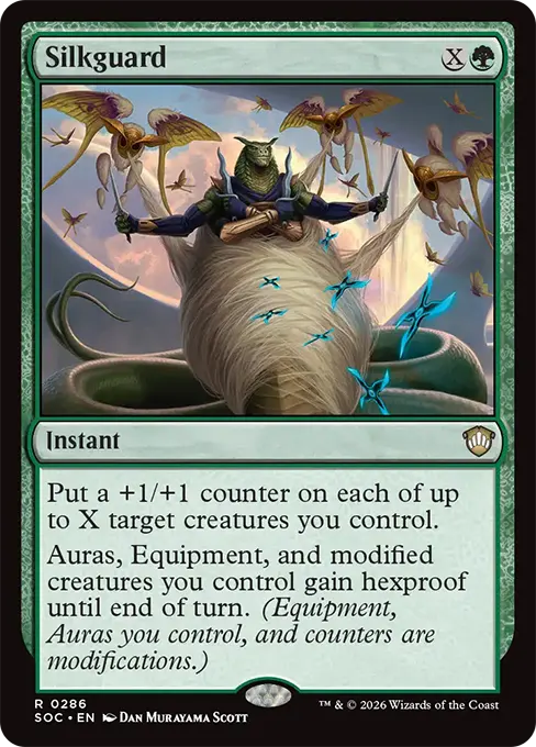 由你操控的靈氣、武具與有飾裝的生物獲得辟邪異能直到回合結束。(武具,指示物,以及由你操控的靈氣均為飾裝。)