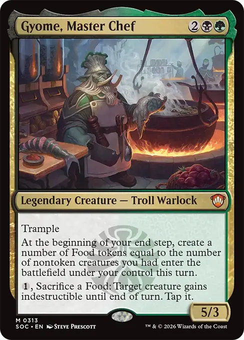 傳奇生物 – 巨魔/邪術師踐踏在你的結束步驟開始時,派出若干食品衍生物,其數量等同於本回合中在你操控下進戰場之非衍生物的生物數量。{1},犧牲一個食品:目標生物獲得不滅異能直到回合結束。將它橫置。