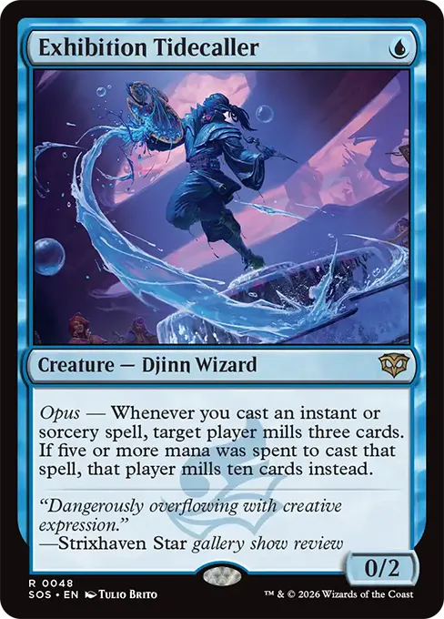 炫示~每當你施放瞬間或巫術咒語時,目標玩家磨三張牌。若施放該咒語時支付過五點或更多魔法力,則改為該玩家磨十張牌。