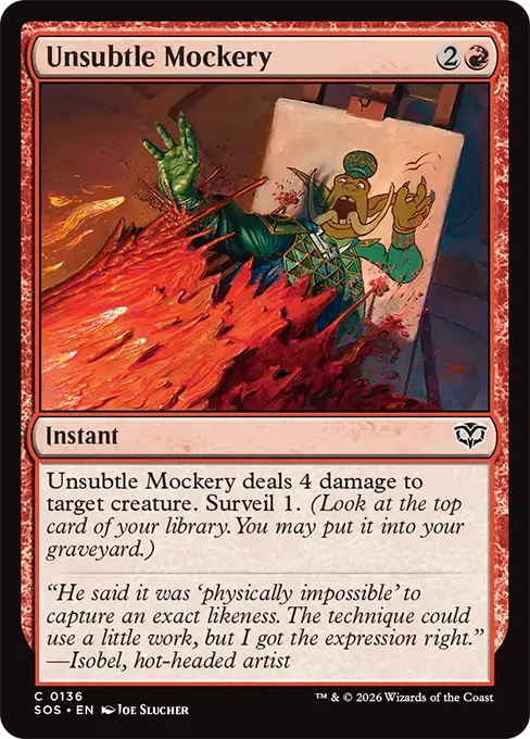 粗劣摹畫對目標生物造成4點傷害。刺探1。(檢視你牌庫頂的牌。你可以將其置入你墳墓場。)