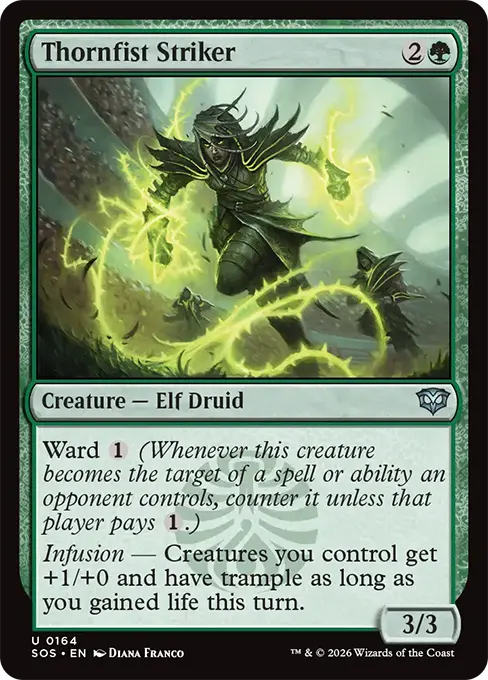 生物 – 妖精/德魯伊守護{1}(每當此生物成為由對手操控之咒語或異能的目標時,除非該玩家支付{1},否則反擊之。)輸注~只要你本回合中獲得過生命,則由你操控的生物便得+1/+0且具有踐踏異能。