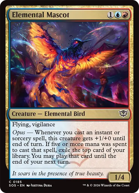 生物 – 元素/鳥飛行,警戒炫示~每當你施放瞬間或巫術咒語時,此生物得+1/+0直到回合結束。如果施放該咒語支付了五點或更多魔法力,則放逐你的牌庫頂牌。直到你下一個回合的回合結束,你可以使用該牌。