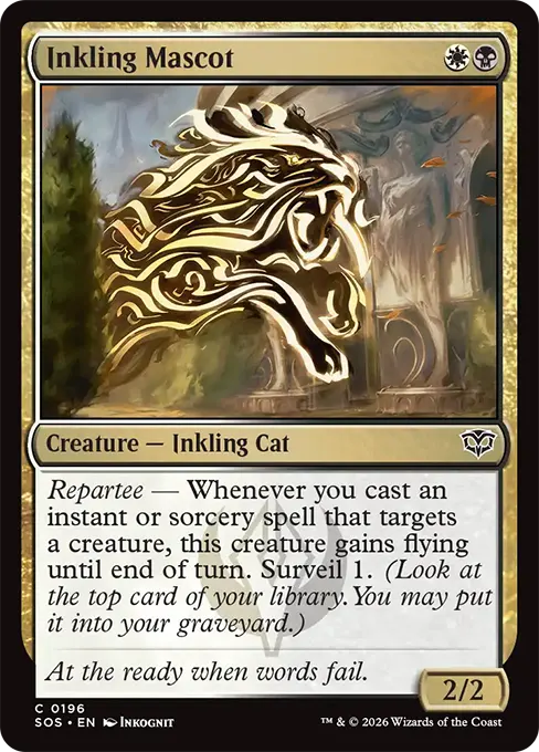 連辭~每當你施放以生物為目標的瞬間或巫術咒語時,此生物獲得飛行異能直到回合結束。刺探1。(檢視你牌庫頂的牌。你可以將其置入你墳墓場。)