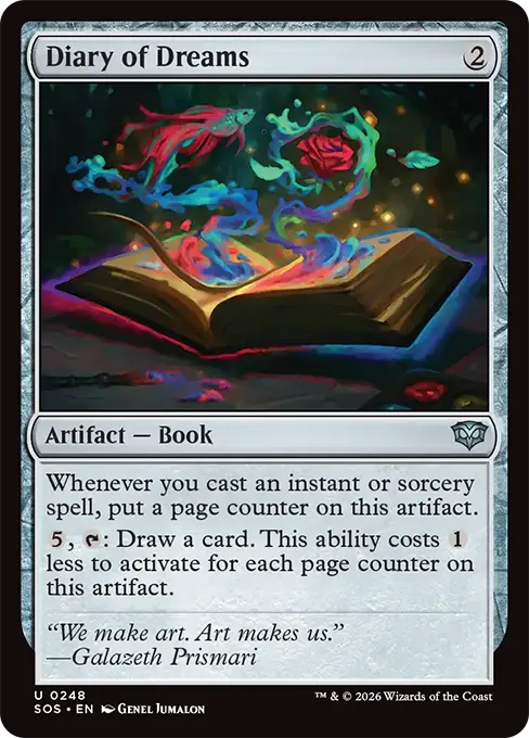 {5},{T}:抽一張牌。此神器上每有一個書頁指示物,此異能便減少{1}來起動。