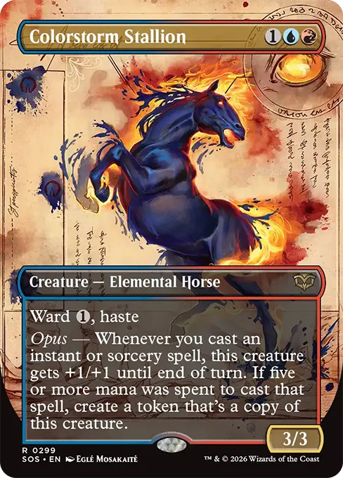 炫示~每當你施放瞬間或巫術咒語時,此生物得+1/+1直到回合結束。如果施放該咒語支付了五點或更多魔法力,則派出一個為此生物複製品的衍生物。