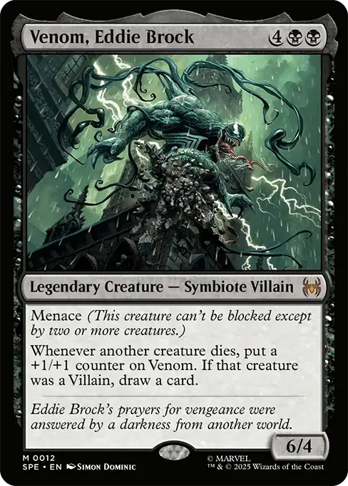 每當另一個生物死去時,在毒液上放置一個+1/+1指示物。如果該死去生物是反派,則抽一張牌。
