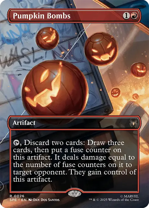 {T},棄兩張牌:抽三張牌,然後在此神器上放置一個引信指示物。它對目標對手造成傷害,其數量等同於其上的引信指示物數量。該玩家獲得此神器的操控權。