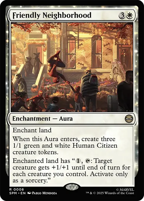 結界 – 靈氣結附於地當此靈氣進場時,派出三個1/1綠白雙色的人類/市民衍生生物。所結附的地具有「{1},{T}:你每操控一個生物,目標生物便得+1/+1直到回合結束。只能於巫術時機起動。」