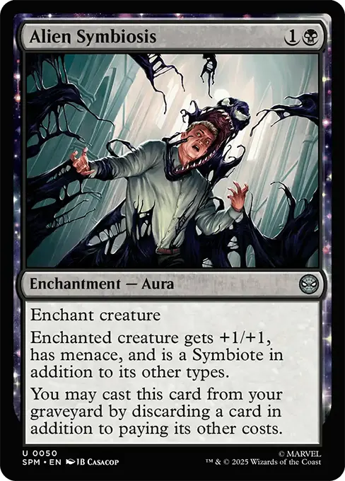 所結附的生物得+1/+1,具有威懾異能,且額外具有共生體此類別。