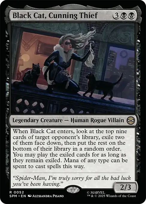 當黑貓進場時,檢視目標對手牌庫頂的九張牌,將其中兩張牌面朝下地放逐,然後將其餘的牌以隨機順序置於其牌庫底。於所放逐之牌持續放逐的時段內,你可以使用它們。能用任意種類的魔法力來以此法施放咒語。