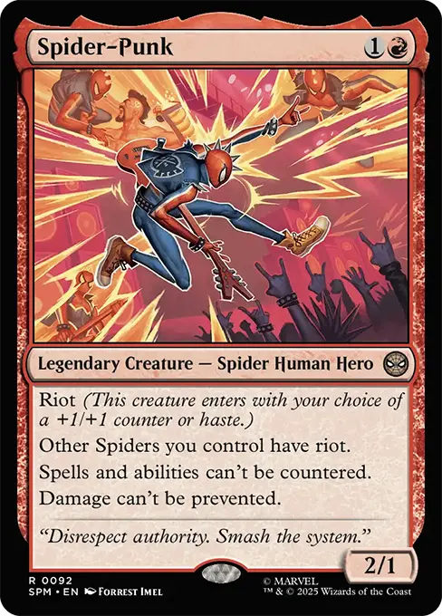 傳奇生物 – 蜘蛛/人類/英雄起事(於此生物進場時,你選擇「+1/+1指示物」或「敏捷」。它進場時上面有所選加成。)由你操控的其他蜘蛛具有起事異能。咒語和異能不能被反擊。傷害不能被防止。