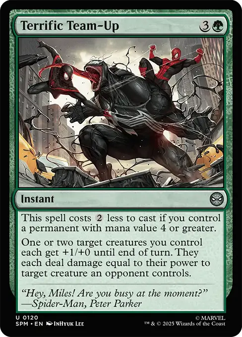 一個或兩個目標由你操控的生物各得+1/+0直到回合結束。它們各依其力量向目標由對手操控的生物造成傷害。