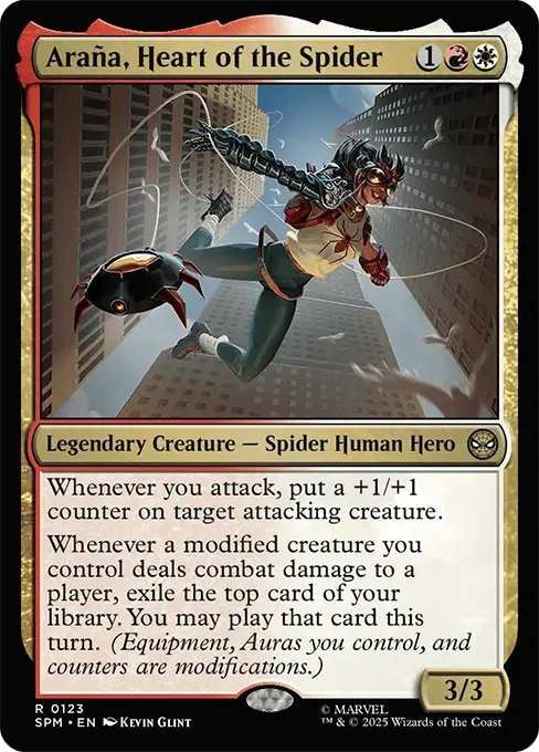 每當一個由你操控且有飾裝的生物對任一玩家造成戰鬥傷害時,放逐你的牌庫頂牌。本回合中,你可以使用該牌。(武具,指示物,以及由你操控的靈氣均為飾裝。)