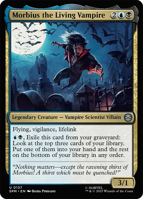 {U}{B},從你墳墓場放逐此牌:檢視你牌庫頂的三張牌。將其中一張置於你手上,其餘則以任意順序置於你牌庫底。